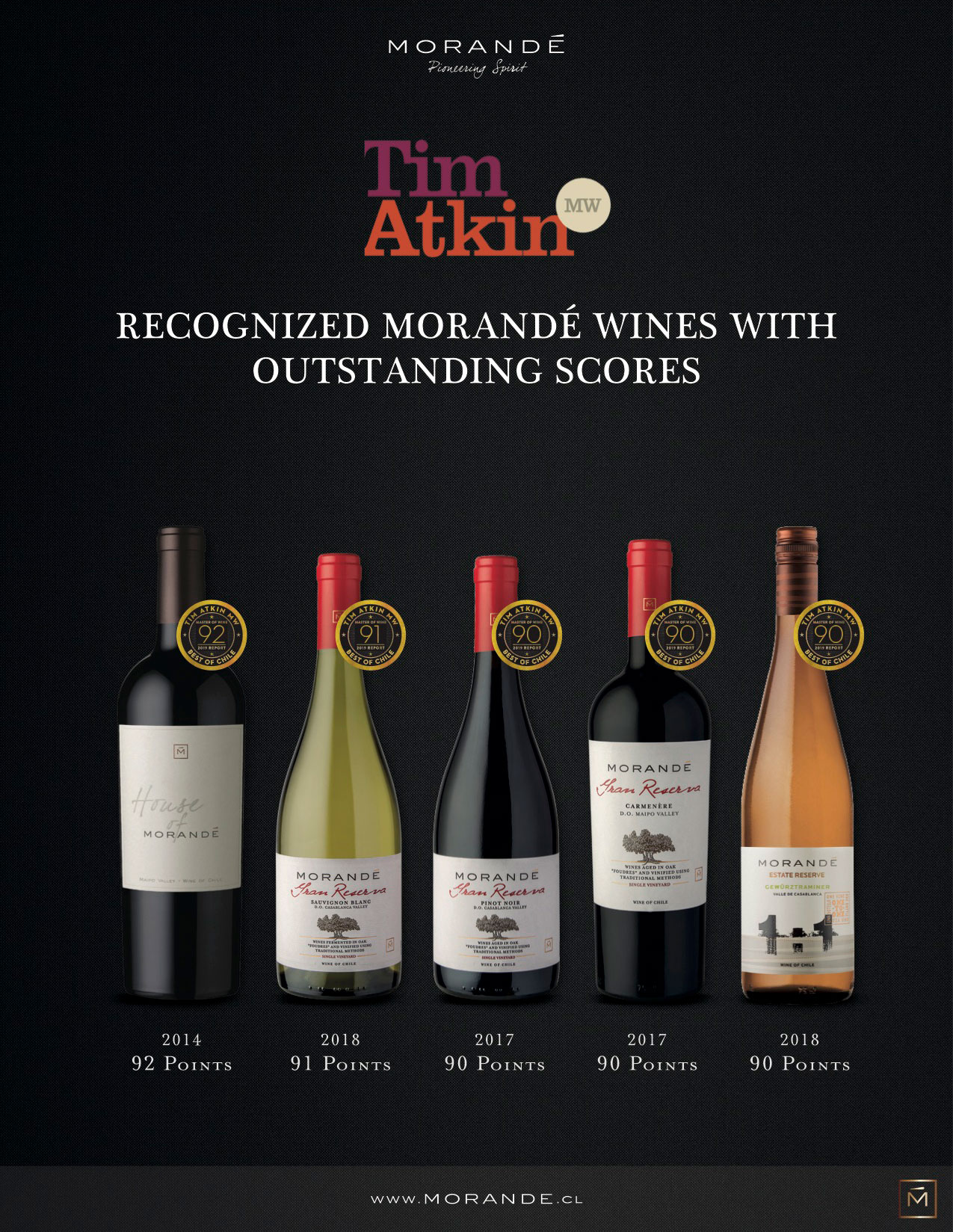 Morandé Gran Reserva Pinot Noir 2017, Gran Reserva Carmenère 2017 and Estate Reserve Gewürztraminer 2018 obtained 90 points, while Gran Reserva Sauvignon Blanc 2018 obtained 91 points and House of Morandé 2014 scored 92 points.