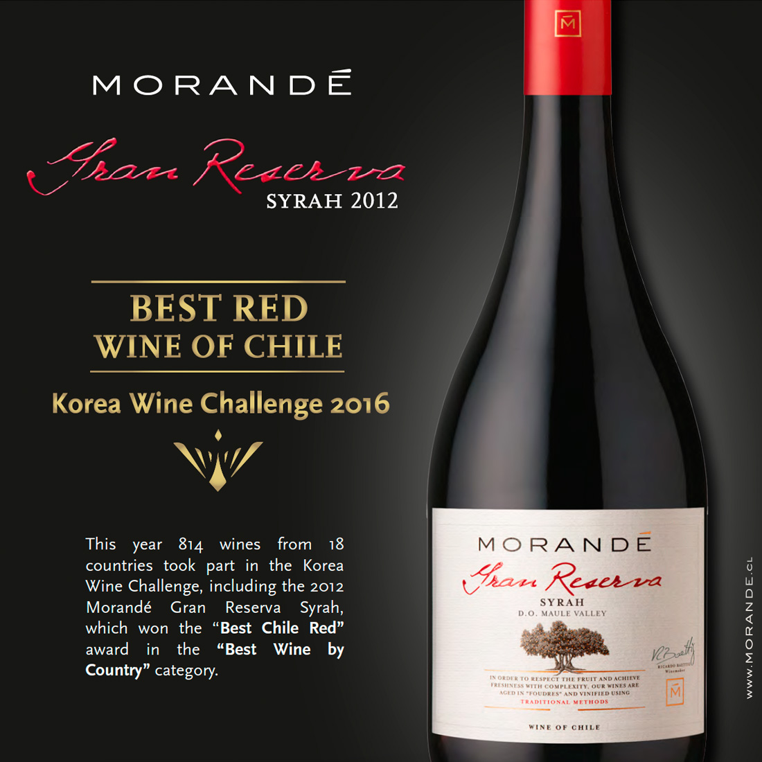 This year 814 wines from 18 different countries were registered in the Korea Wine Challenge. Among which Morandé Gran Reserva Syrah 2012 received the "Best Chilean red wine" award, in the category of "Best wine" in the country.